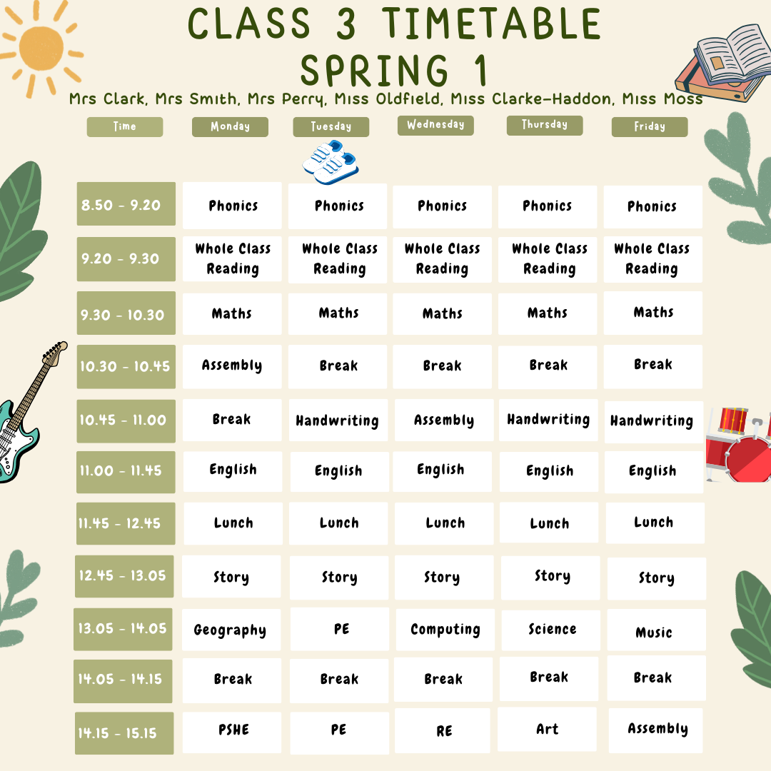 Mrs Smith (Mon PM and Thurs), Mrs Perry (Mon-Weds AM), Miss Oldfield (Weds PM-Fri),